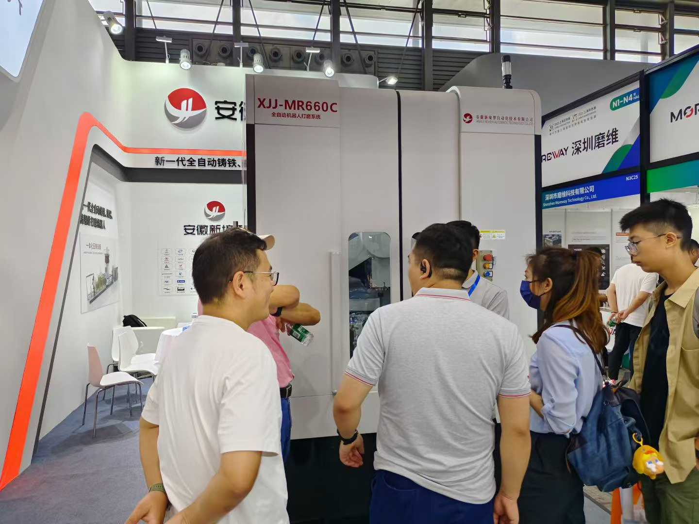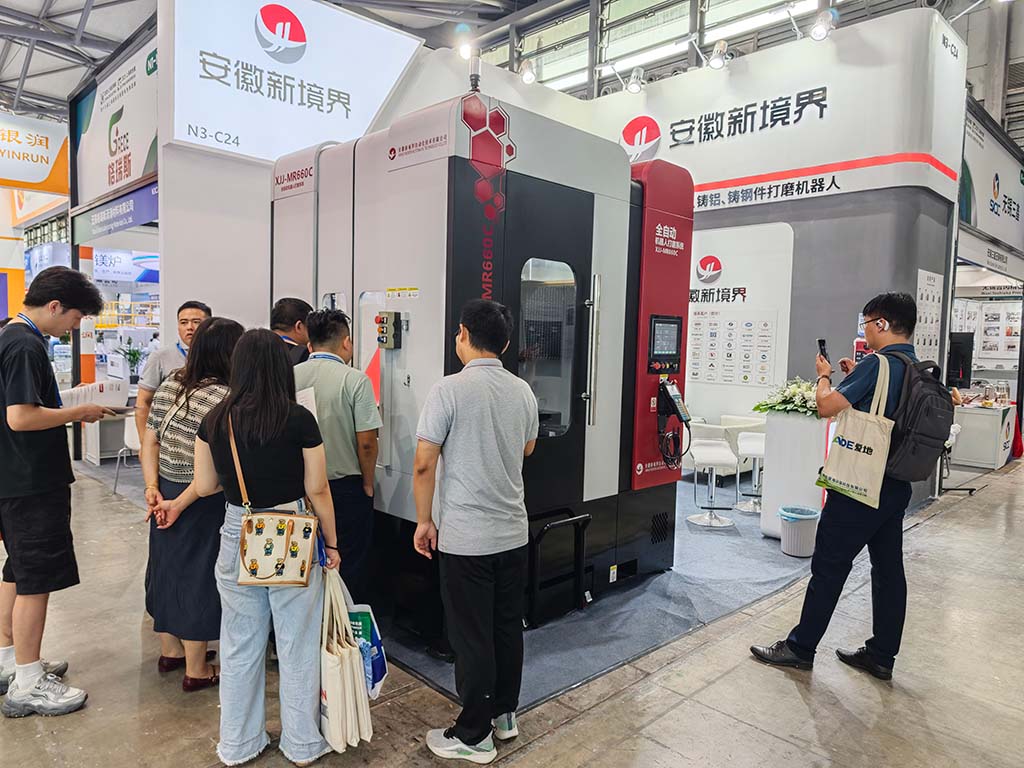 在展會(huì)現(xiàn)場(chǎng),新境界展位前人頭攢動(dòng)。MR-660C 鋁件打磨機(jī)器人一經(jīng)展示,便憑借其高效、精準(zhǔn)、智能的特點(diǎn),迅速成為全場(chǎng)焦點(diǎn)。國(guó)內(nèi)外觀眾紛紛被機(jī)器人流暢的打磨動(dòng)作、穩(wěn)定的運(yùn)行狀態(tài)所吸引,不少人停下腳步,仔細(xì)觀察機(jī)器人的工作過(guò)程,向工作人員詳細(xì)咨詢?cè)O(shè)備的性能參數(shù)、適用場(chǎng)景、操作方式等信息。